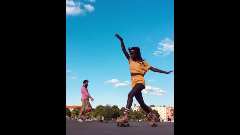 There was this one Instagram video that made Oumi Janta’s followers increase rapidly in summer 2020. The video shows her skating in Tempelhofer Feld in Berlin. However, the young woman who was born in Senegal and grew up in Germany does more than just skate. Oumi Janta is dancing on her roller skates, gliding over the tarmac elegantly and casually to music in a way that is so confident that even celebrities such as Alicia Keys reposted her video. Some people refer to her mixture of dancing, gymnastics and roller skating as jam skating, but Oumi Janta has her very own style that also features elements from artistic roller skating.